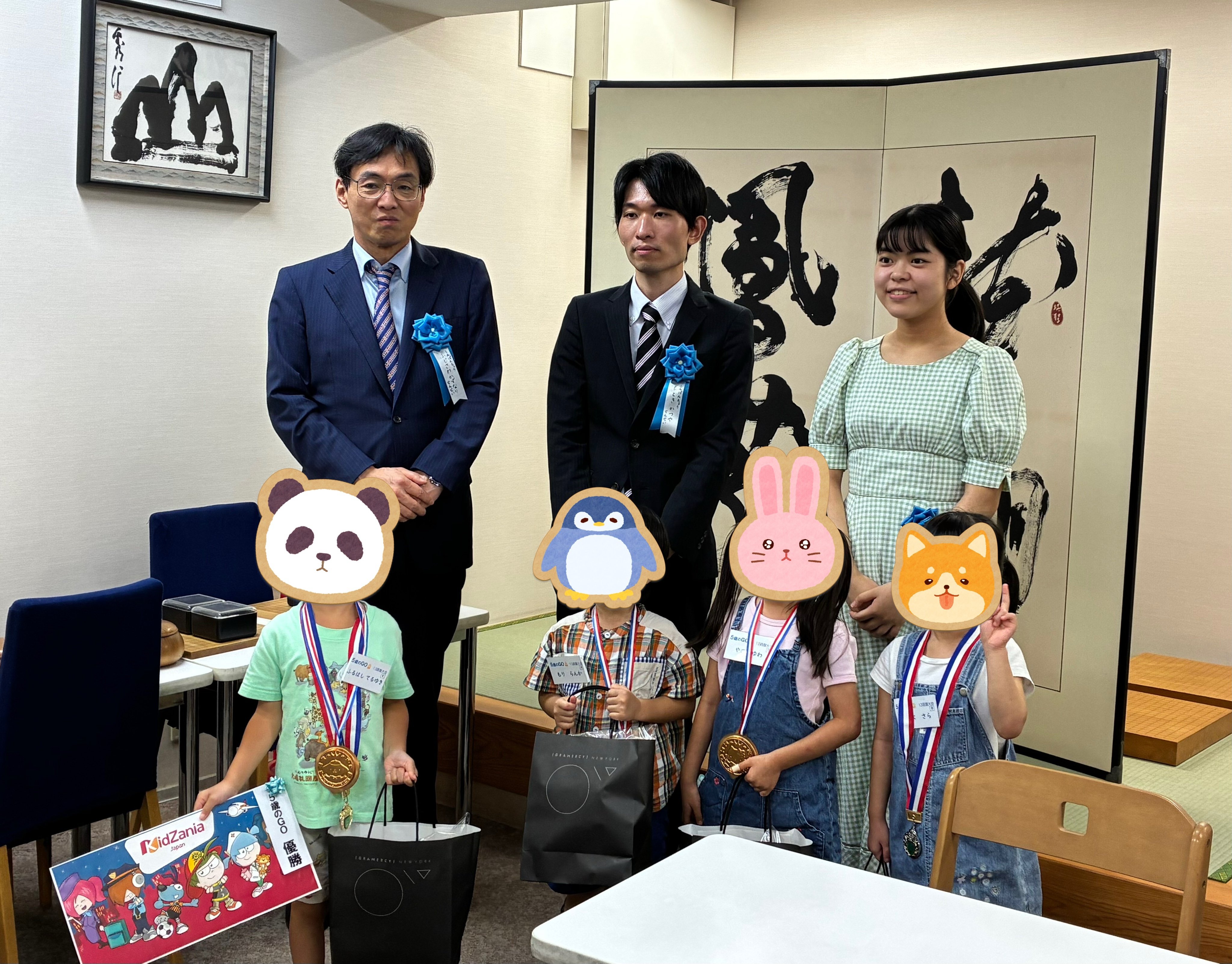 左から甲田明子四段、長男、一力遼棋聖、佐田篤史七段